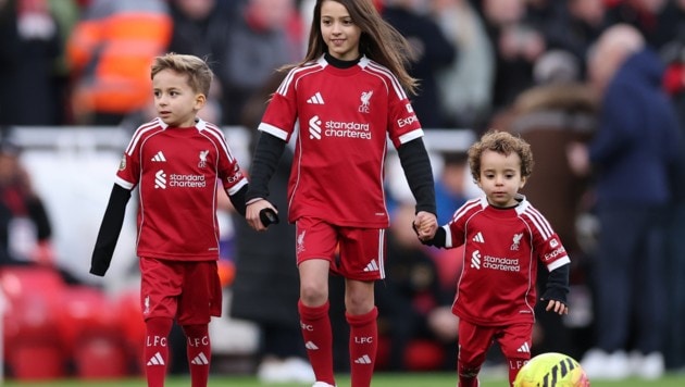 Dazu zeigt die Jota-Witwe Bilder von einem sehr berührenden Nachmittag. Der FC Liverpool hatte das Meisterschaftsspiel gegen Wolverhampton ganz dem verstorbenen Portugiesen gewidmet – verständlich, hatte Jota doch vor seinen fünf Jahren bei Liverpool vier drei Jahre lang für Wolverhampton gespielt. Berührend: Jotas drei hinterbrliebne Kinder durften als Einlauf-Kids mit den Stars auf den Rasen. Die Fans huldigten ihrem ehemaligen Helden mit einem großen Transparent. Ein würdiger Rahmen für einen großen Spieler, der vom Himmel aus zusah.